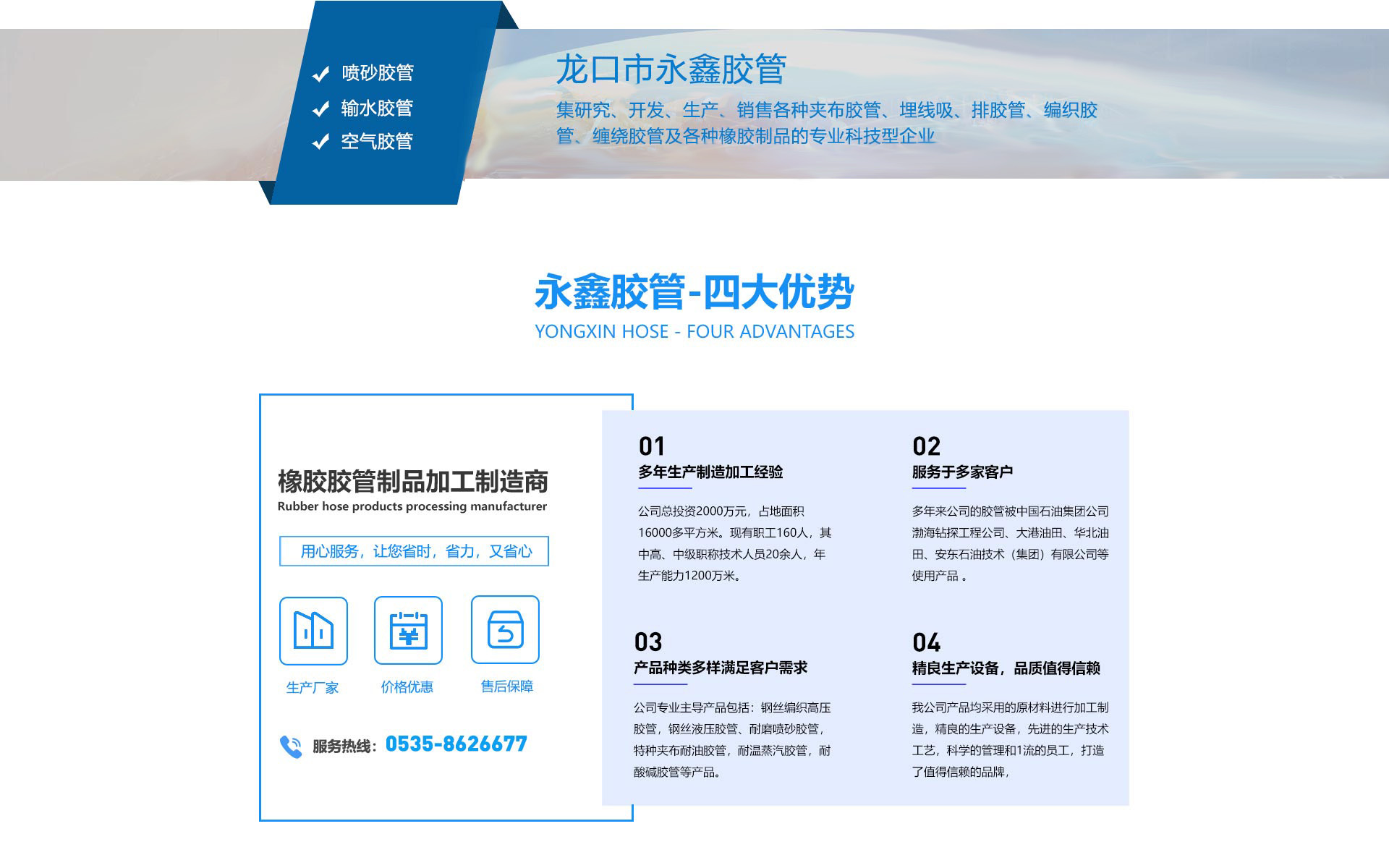 龍口市永鑫膠管有限公司始建于1979年。位于山東半島北端——龍口市,毗鄰龍口港、威烏高速公路和大萊龍鐵路,商業(yè)運(yùn)輸,交通方便,地理位置好。公司總投資2000萬(wàn)元,占地面積16000多平方米?,F(xiàn)有職工160人,其中高、中級(jí)職稱(chēng)技術(shù)人員20余人,年生產(chǎn)能力1200萬(wàn)米。多年來(lái)公司的膠管被中國(guó)石油集團(tuán)公司渤海鉆探工程公司、大港油田、華北油田、安東石油技術(shù)(集團(tuán))有限公司等使用產(chǎn)品我公司迎著十八界三中全會(huì)的改革大潮始終闊步向前,目前我公司主要從事高低壓橡膠軟管、鉆探膠管、夾布膠管、噴砂膠管、橡膠管帶制品,等產(chǎn)品的生產(chǎn)和研發(fā),主導(dǎo)產(chǎn)品包括:生產(chǎn),研制高低壓橡膠軟管、輸送皮帶等以橡塑為主的產(chǎn)品,擁有各類(lèi)進(jìn)口,國(guó)產(chǎn)生產(chǎn)設(shè)備120多臺(tái)套,化驗(yàn),分析,試驗(yàn)儀器設(shè)備種類(lèi)多,檢測(cè)手段完善。我公司產(chǎn)品均采用的原材料進(jìn)行加工制造,精良的生產(chǎn)設(shè)備和穩(wěn)定技術(shù)工藝,科學(xué)的管理,打造了客戶(hù)信任的牌子,先后與多家石油、化工、汽車(chē)制造等大型國(guó)有企...